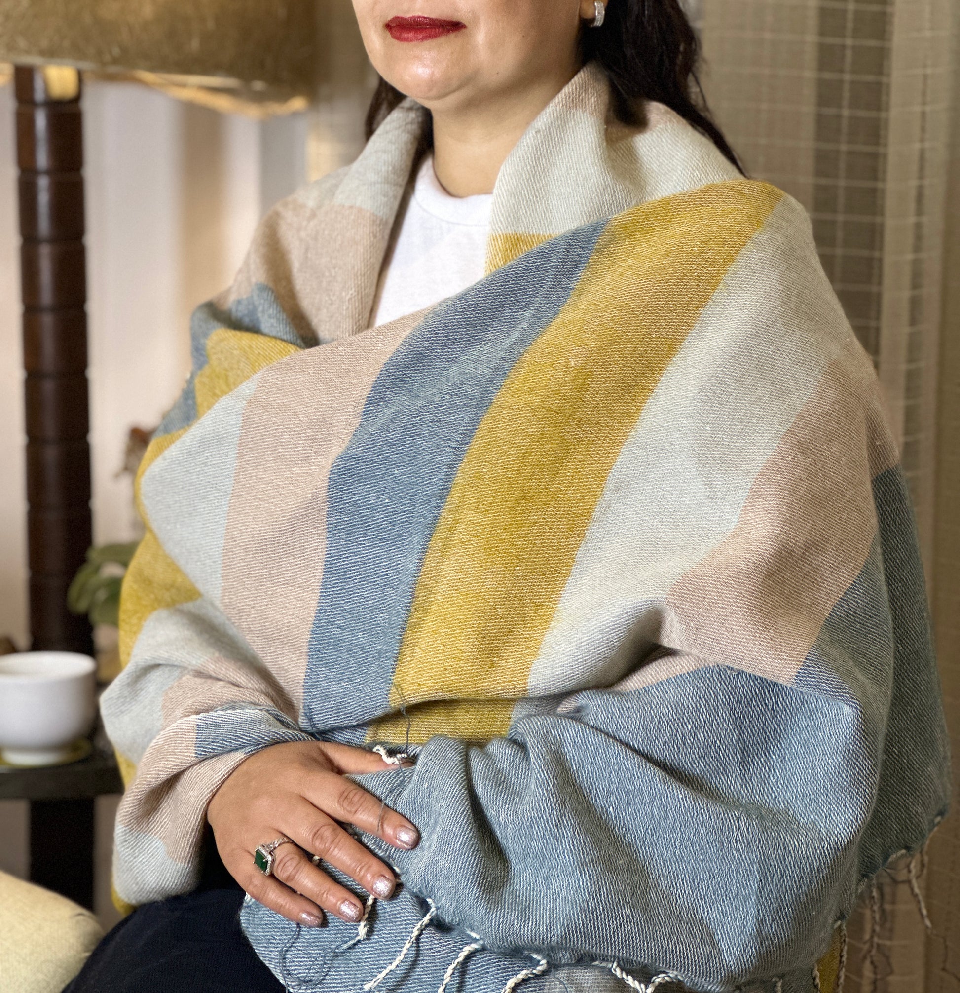 The scarf is made up of Yak wool, a special type of wool found in the underbelly of mountain buffalo. The wool is naturally warm and soft.