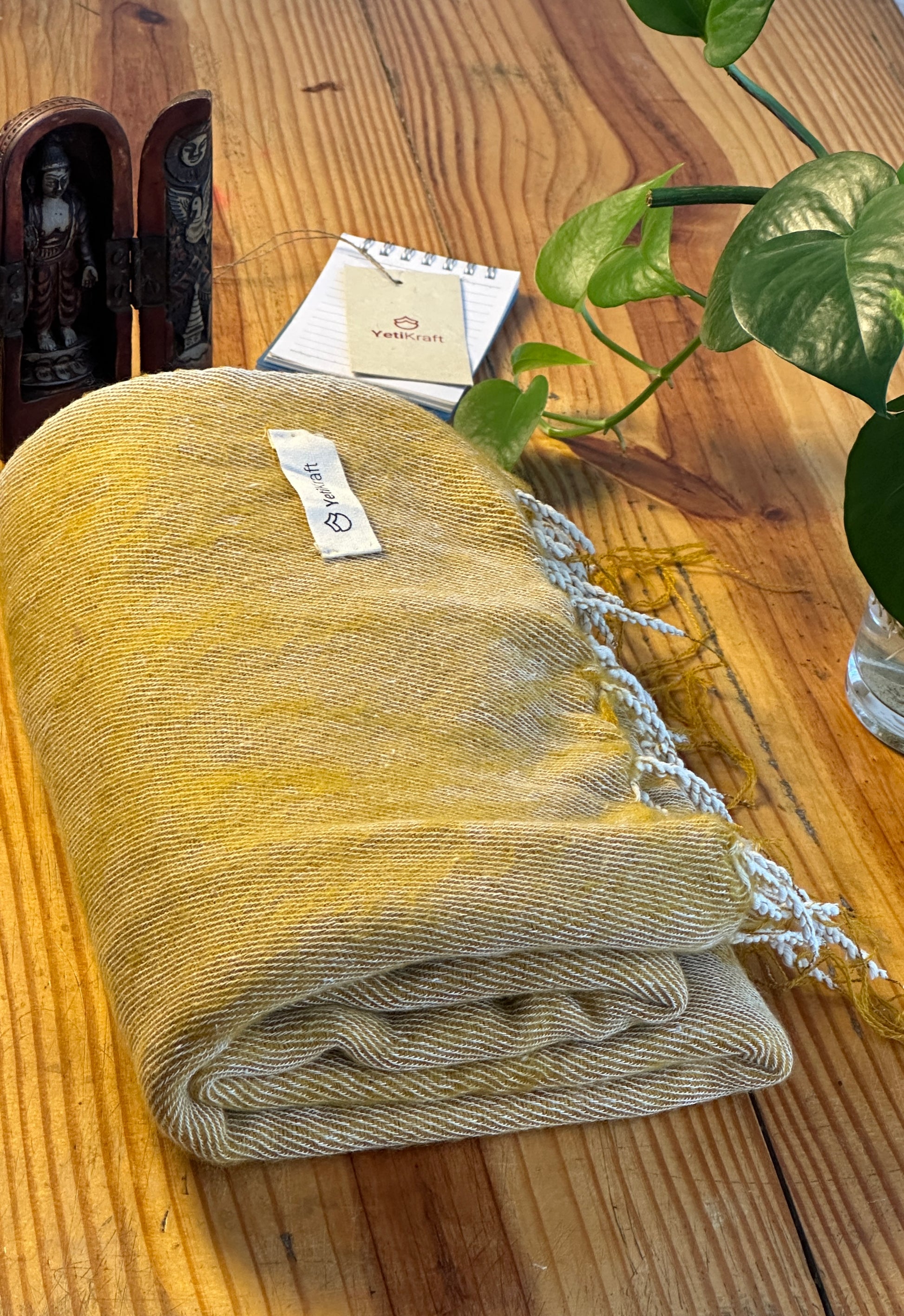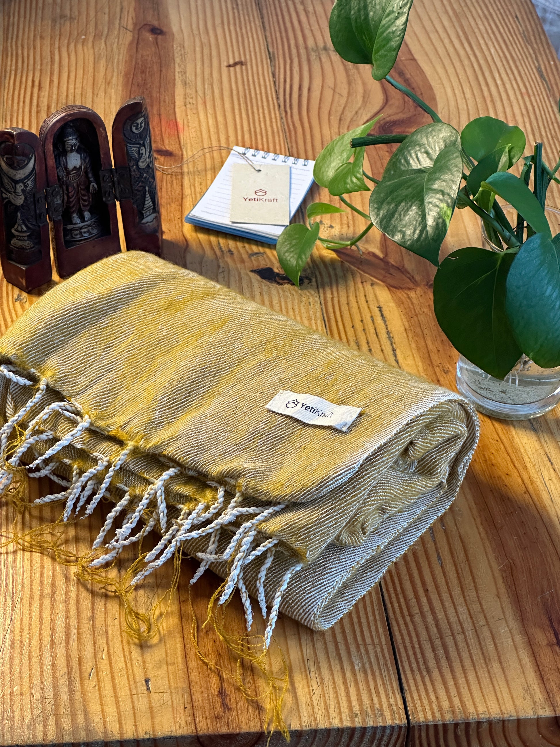 The scarf is made up of Yak wool, a special type of wool found in the underbelly of mountain buffalo. The wool is naturally warm and soft.