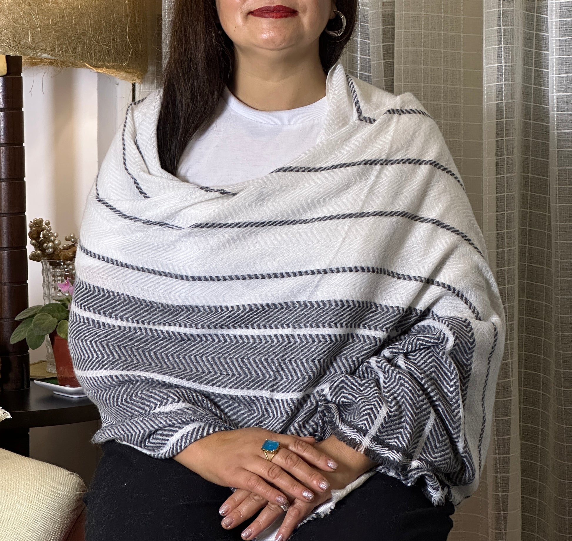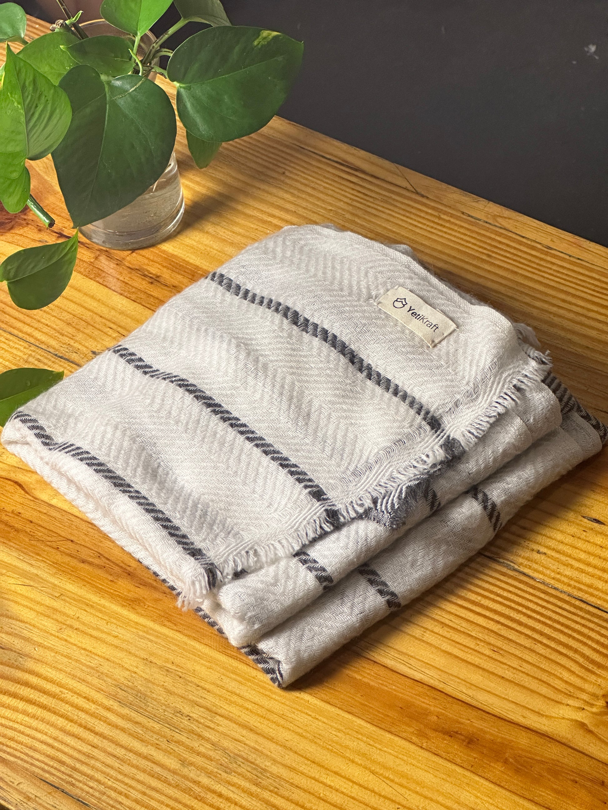 The scarf is made up of Yak wool, a special type of wool found in the underbelly of mountain buffalo. The wool is naturally warm and soft.