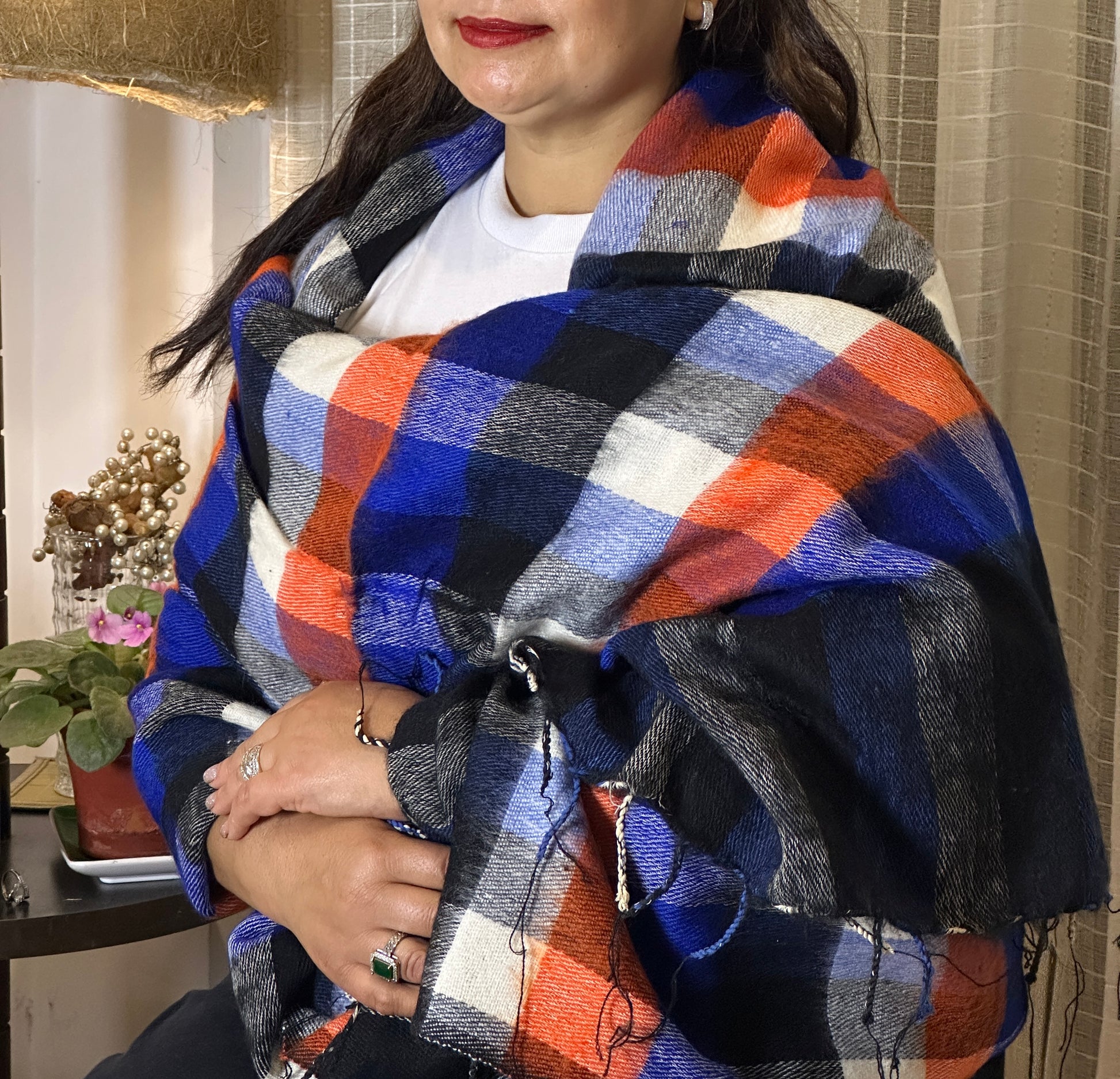 The scarf is made up of Yak wool, a special type of wool found in the underbelly of mountain buffalo. The wool is naturally warm and soft.