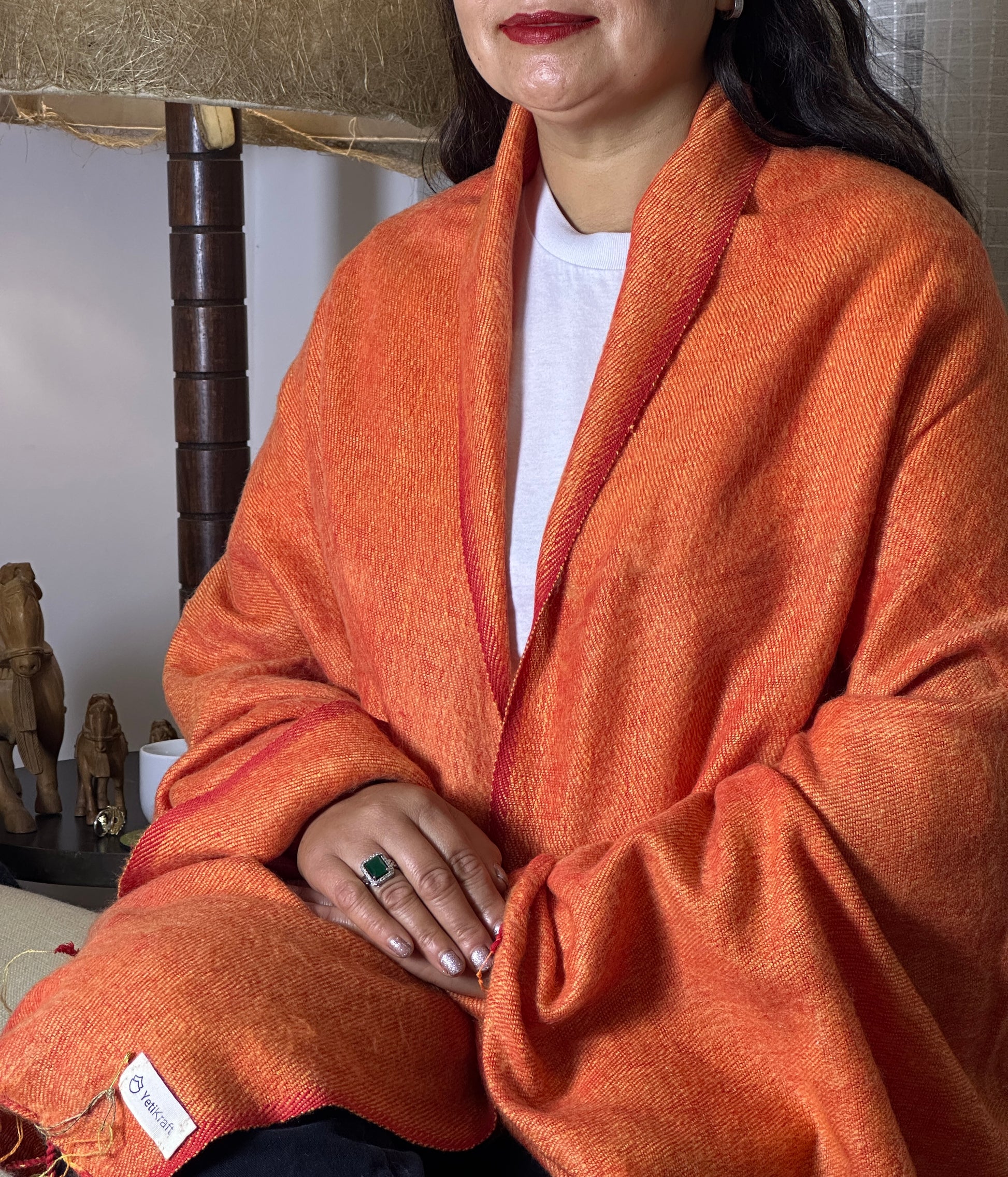 The scarf is made up of Yak wool, a special type of wool found in the underbelly of mountain buffalo. The wool is naturally warm and soft.